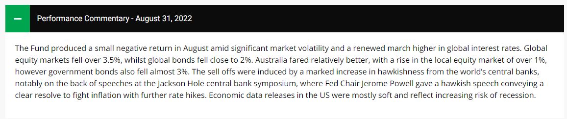 The Fund produced a small negative return in August amid significant market volatility and a renewed march higher in global interest rates. Global equity markets fell over 3.5%, whilst global bonds fell close to 2%. Australia fared relatively better, with a rise in the local equity market of over 1%, however government bonds also fell almost 3%. The sell offs were induced by a marked increase in hawkishness from the world’s central banks, notably on the back of speeches at the Jackson Hole central bank symposium, where Fed Chair Jerome Powell gave a hawkish speech conveying a clear resolve to fight inflation with further rate hikes. Economic data releases in the US were mostly soft and reflect increasing risk of recession.