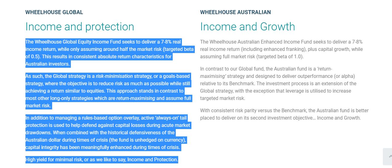 Wheelhouse Global Equity Income aims to generate 7-8% in annual income while only taking half the risk of Global equities. In addition, to outperform the Benchmark over a rolling 5-year period. Systematic income generative overlay (Buywrite) with integrated tail protection.