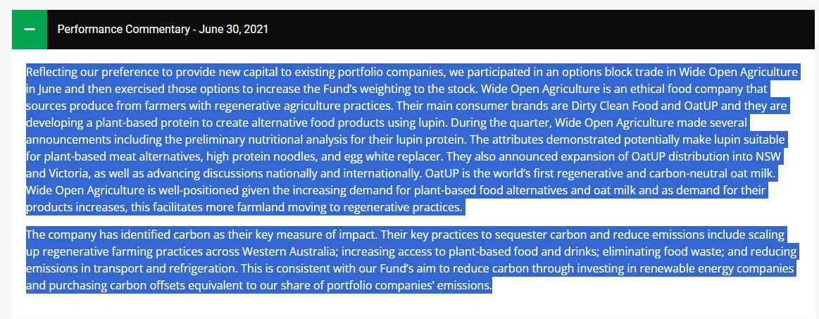 Reflecting our preference to provide new capital to existing portfolio companies, we participated in an options block trade in Wide Open Agriculture in June and then exercised those options to increase the Fund's weighting to the stock. Wide Open Agriculture is an ethical food company that sources produce from farmers with regenerative agriculture practices. Their main consumer brands are Dirty Clean Food and OatUP and they are developing a plant-based protein to create alternative food products using lupin. During the quarter, Wide Open Agriculture made several announcements including the preliminary nutritional analysis for their lupin protein. The attributes demonstrated potentially make lupin suitable for plant-based meat alternatives, high protein noodles, and egg white replacer. They also announced expansion of OatUP distribution into NSW and Victoria, as well as advancing discussions nationally and internationally. OatUP is the world's first regenerative and carbon-neutral oat milk. Wide Open Agriculture is well-positioned given the increasing demand for plant-based food alternatives and oat milk and as demand for their products increases, this facilitates more farmland moving to regenerative practices.
