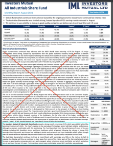 The Investors Mutual All Industrials Share Fund enjoyed a strong month, returning +5.2%, which was slightly behind the benchmark’s return of +5.6%. The Fund’s caution to the overvalued Technology sector held back relative performance, although we remain comfortable with this positioning. The Fund benefited from the performance of many of its core holdings including IAG, Steadfast, Amcor and Sonic Healthcare which all gained following the release of strong FY21 earnings. Over the month, we trimmed our holdings in stocks such as Amcor and Event Hospitality which rallied strongly over the month while we deployed the proceeds to add to our positions in good quality companies such as Orica.