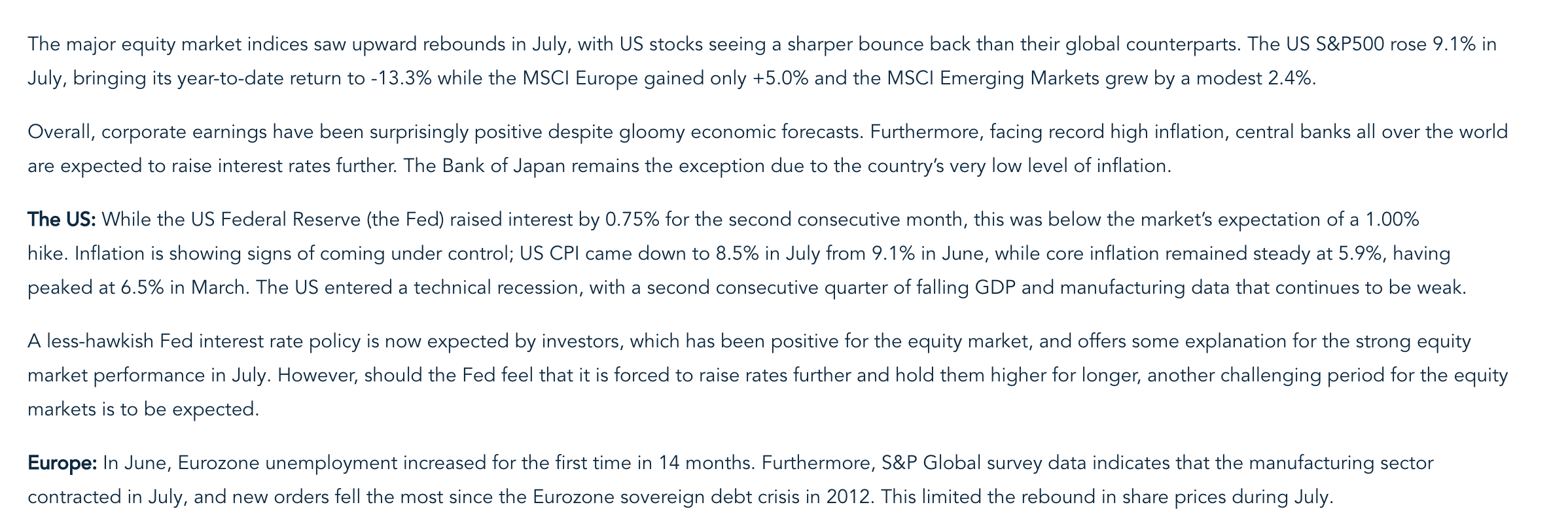 A less-hawkish Fed interest rate policy is now expected by investors, which has been positive for the equity market, and offers some explanation for the strong equity market performance in July. However, should the Fed feel that it is forced to raise rates further and hold them higher for longer, another challenging period for the equity markets is to be expected.