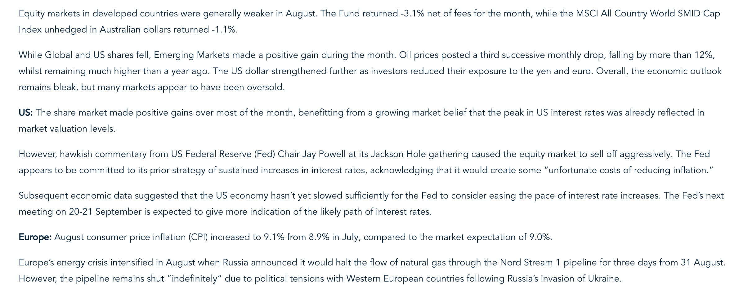Equity markets in developed countries were generally weaker in August. The Fund returned -3.1% net of fees for the month, while the MSCI All Country World SMID Cap Index unhedged in Australian dollars returned -1.1%.