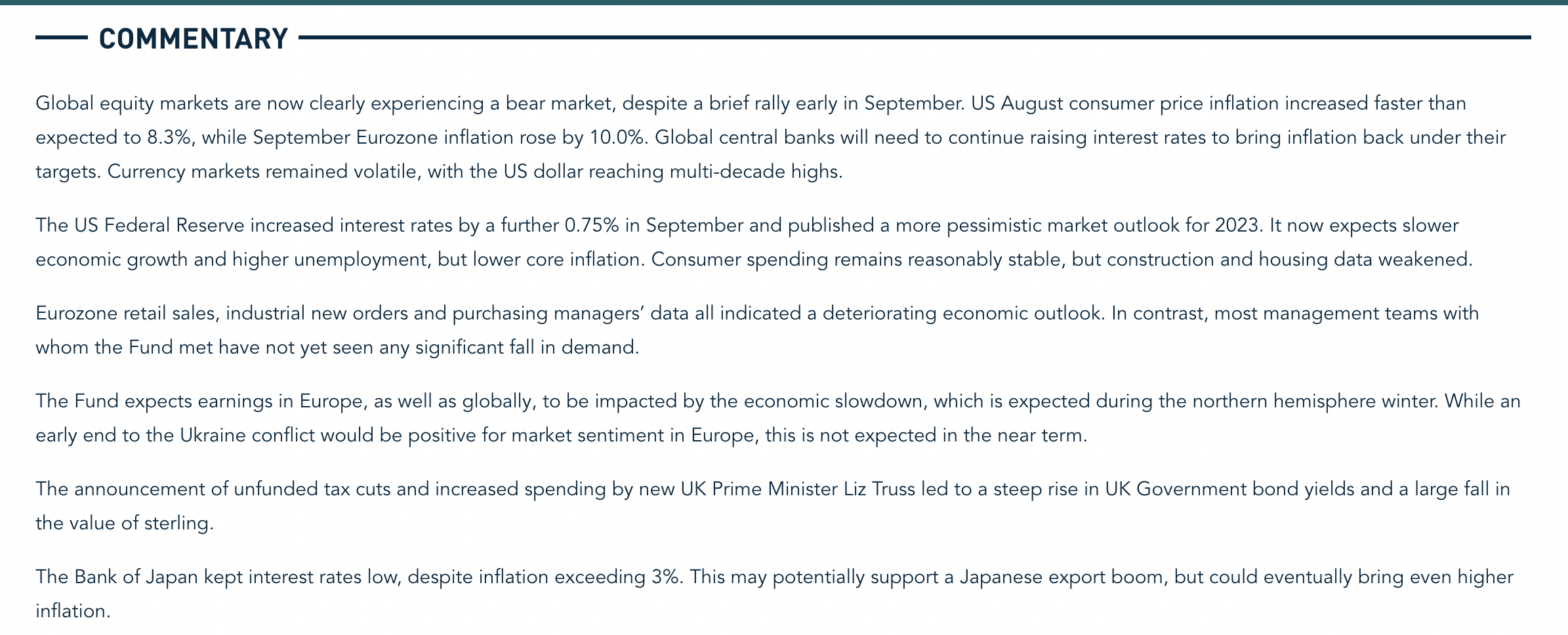 Global equity markets are now clearly experiencing a bear market, despite a brief rally early in September. US August consumer price inflation increased faster than expected to 8.3%, while September Eurozone inflation rose by 10.0%. Global central banks will need to continue raising interest rates to bring inflation back under their targets. Currency markets remained volatile, with the US dollar reaching multi-decade highs.