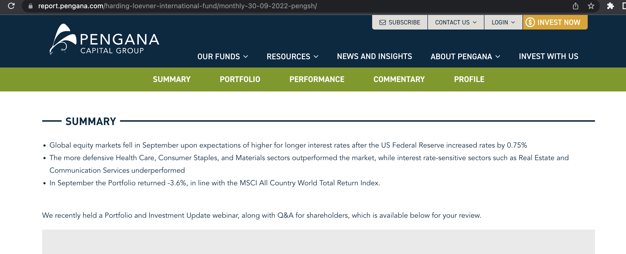 Global equity markets fell in September upon expectations of higher for longer interest rates after the US Federal Reserve increased rates by 0.75% The more defensive Health Care, Consumer Staples, and Materials sectors outperformed the market, while interest rate-sensitive sectors such as Real Estate and Communication Services underperformed In September the Portfolio returned -3.6%, in line with the MSCI All Country World Total Return Index.