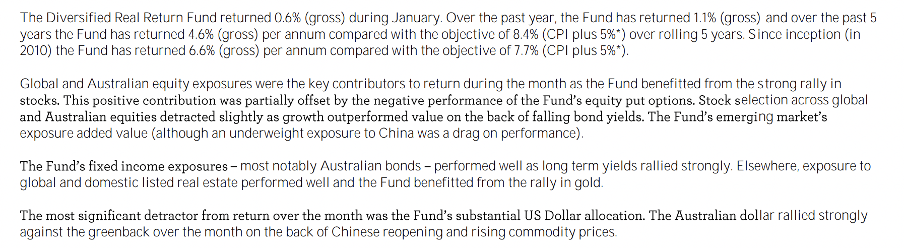 The Diversified Real Return Fund returned 0.6% (gross) during January. Over the past year, the Fund has returned 1.1% (gross) and over the past 5 years the Fund has returned 4.6% (gross) per annum compared with the objective of 8.4% (CPI plus 5%*) over rolling 5 years. Since inception (in 2010) the Fund has returned 6.6% (gross) per annum compared with the objective of 7.7% (CPI plus 5%*).