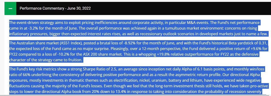 The Fund’s key risk metrics show a strong Sharpe Ratio of 2.5, an average since inception net daily Alpha of 6.1 basis points, and monthly win/loss ratio of 66% underlining the consistency of delivering positive performance and as a result the asymmetric return profile. Our directional Alpha exposures, mostly investments in thematic themes such as electrification, nickel, uranium, battery and lithium, have experienced wide negative fluctuations causing the majority of the Fund’s losses. Even though we feel that the long-term investment thesis still holds, we have taken pro-active steps to lower the directional Alpha book from 20% down to 13.4% in response to taking into consideration the probability of recession severely impacting our long-term thesis. Overall Fund gross exposure ended at 286% as we increased the Event (M&A Risk Arb) bucket to 131% from 104%. Our models identified opportunities in proposed companies’ asset sales and subsequent distribution of capital to shareholders, for a significant portion of their remaining equity value. Examples included Prospect Resources (PSC AU) and Ardent Leisure Group (ALG AU). Those capital return trades offer great optionality for a positive re-rate post distribution of the sales proceeds.